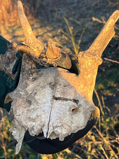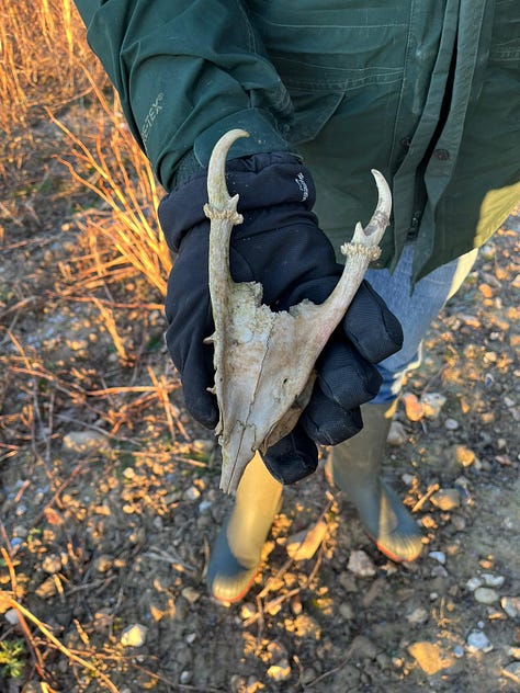 As we reach the far side of the hollow, Ceci spots a bone. It looks like a humerus from a mammal. Then we notice more bones scattered, a skull, and then another. The skulls are not complete, but it is clear from the antlers that one belonged to a roe deer and the other to a muntjac deer. It is a secluded spot, under the shade of trees, next to a wooded hollow, far from roads and out of direct sight from the track. It was probably a good place for an exhausted and ailing animal to rest and die. The bones have been scattered all around by scavengers—foxes and kites perhaps. Part of a jaw. Ribs. Vertebrae. I wonder how long they have been here. The scavengers would make quick work of a corpse, I’m sure.