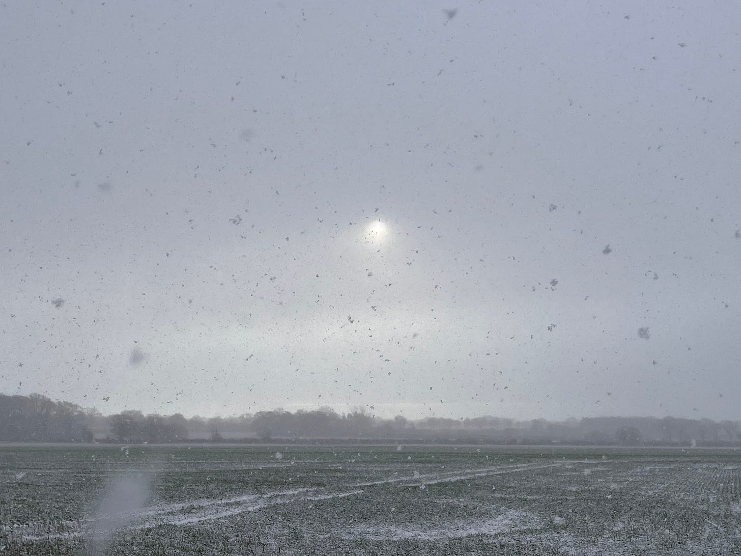 At the top of the lane the snow shower reaches us and the blue sky turns grey, the air dense with large swirling flakes. The sun dims and becomes an alien star viewed from an icy planet. We pull scarves closer and push on up the track to the top. The ice is thick where puddles have cracked. There are the tracks of deer. Frozen horse dung. By the time we turn back our boot prints are already being covered over.
